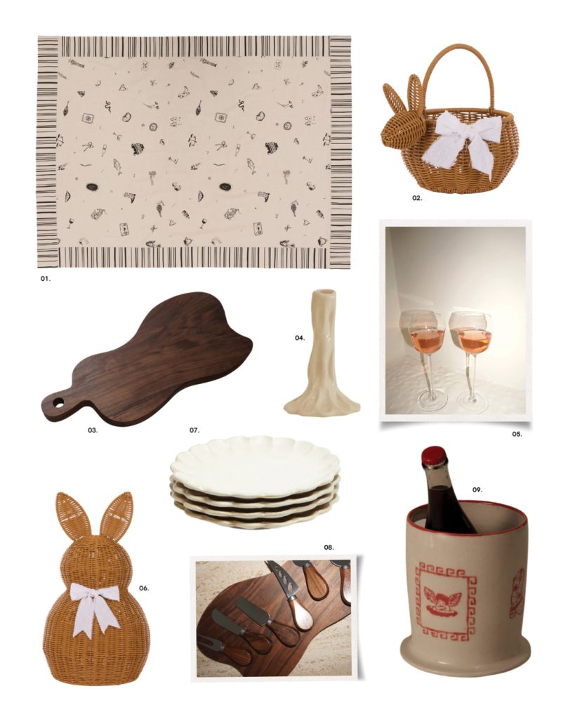 01. Olive’s House O&H + B.G Studio Linen Tablecloth, 02. Woven Bunny Hunter Basket,03. Nara Charcuterie Board 04. Jedda Clay Candle Holder 05. Étoile Glassware Set, 06. Woven Bunny with Bow, 07. Aretae Dinner Plates, 08. Nara Cheese Knife Set, 09. Olive’s House Sid Ceramic Wine Bucket