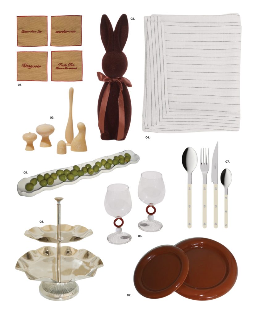 01. Aretae cocktail napkins, 02. Large Flocked Rabbit, 03. Eleven Events candles & holders, 04. Olive’s House Lim Striped Tablecloth, 05. Graza Olive Tray, 06. Eleven Events Viola Glass , 07. Robbii Designs Sabre cutlery set, 08. Gaia Two- Tiered Serving Tray, 09. Chocolate Chubb Plate